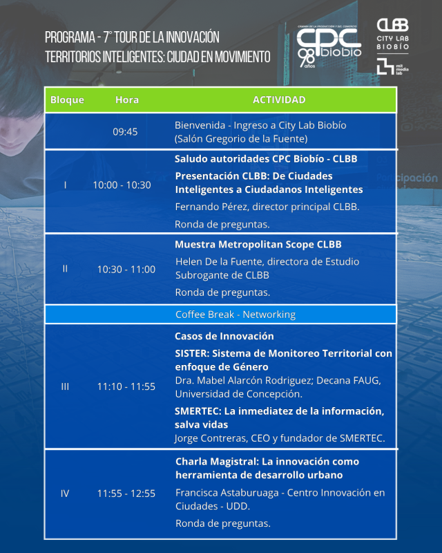 No te pierdas el ÚLTIMO Tour de la Innovación del 2025: «Territorios Inteligentes: Ciudades en Movimiento» 🚀, donde junto a City Lab Biobío profundizaremos en el futuro de los espacios urbanos.👏